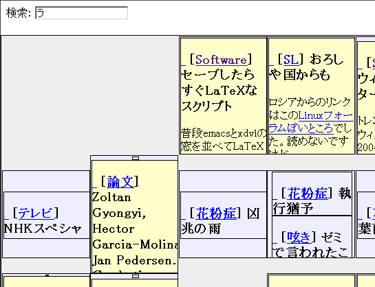 HishiMochiをたどってとりあえず試してみてください。私の2月の日記をカレンダー風に並べたものが表示されます。それぞれの日が第1階層、その日の日記の各エントリが第2階層といった感じになっています。左上の検索ボックスにキーワードを入力すると、ぐにゃぐにゃアニメーションと共にインクリメンタル検索できます。「graphviz hiki」とか「software」あたりが面白いかもしれません。日本語でも検索可能です。検索結果を外から持ってくるようにするとAjaxぽくなるんですがそれは今後の課題ですね。MozillaとFirefoxで動作を確認していますが、IEは多分無理です。